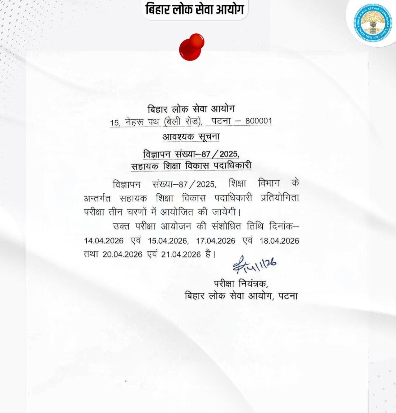 BPSC AEDO Admit Card 2026 :- बिहार लोक सेवा आयोग (बीपीएससी) ने सहायक शिक्षा विकास अधिकारी (एईडीओ) पदों के लिए आवेदन प्रक्रिया 12 दिसंबर 2025 तक पूरा कर लिया हैं। और साथ ही परीक्षा तिथि की भी घोषणा आधिकारिक तौर पर दिया गया हैं। सहायक शिक्षा विकास अधिकारी (एईडीओ) की परीक्षा 14, 15, 17, 18, 20 और 21 अप्रैल 2026 तक निर्धारित की गयी हैं। जिसके लिए एडमिट कार्ड 3 अप्रैल 2026 को जारी कर दिया जाएगा। सभी उमीदवार अपना एडमिट कार्ड आवेदन संख्या और पासवर्ड की मदद से ऑनलाइन माध्यम से डाउनलोड कर सकते हैं। जिसकी जानकारी इस पोस्ट में आपको बताने वाले हैं।