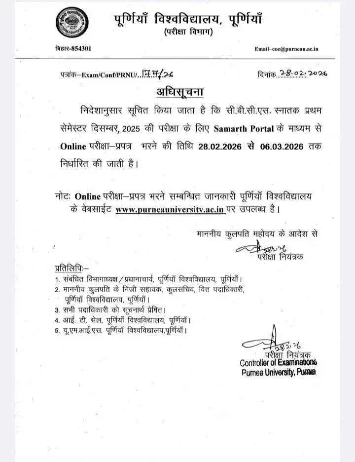 तो क्या आप लोग भी पूर्णिया विश्वविद्यालय युजी सेमेस्टर 1 सत्र 2025 29 में नामांकन प्राप्त किए हैं तो आपको आज से ऑनलाइन के प्रक्रिया के द्वारा यह परीक्षा फॉर्म अवश्य भरना होगा तथा परीक्षा फॉर्म भरने के लिए अंतिम तिथि नोटिस के अनुसार 6 मार्च 2026 निर्धारित किया गया है, यह परीक्षा फॉर्म भरने के बाद कॉलेज में जमा करके वेरीफाई करवाना होगा जिसके बाद ही विश्वविद्यालय के द्वारा प्रवेश पत्र जारी किया जाएगा।